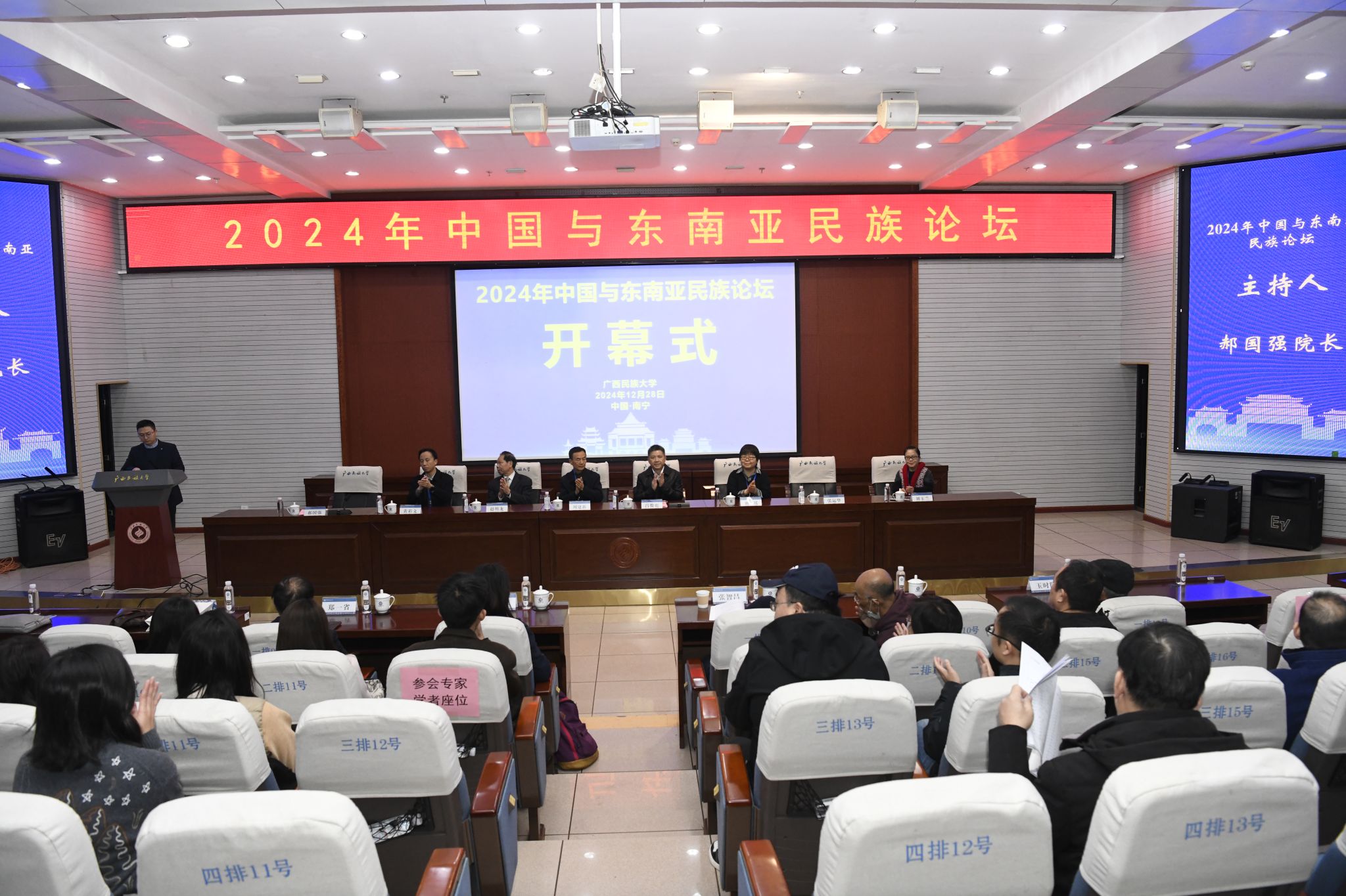 12月28日,为促进区域间的文化互鉴与共同发展,2024年中国与东南亚民族论坛在我校相思湖校区顺利举行。学校党委常委、副校长吕俊彪,《世界民族》副主编、编辑部主任,中国社会科学院研究员刘泓,云南大学教授周建新,广西社会科学院东南亚与国际(地区)问题研究学部主任赵明龙,《马来西亚华人研究》学刊主编、马来西亚泰莱大学张运华,印度尼西亚万隆天主教大学教授张智昌、邱崇义,马来西亚拉曼大学副教授陈爱梅,泰国清莱皇家大学研究员刘玉兰等国内外学者,及我校本科生、研究生代表参会。本次会议由m88,m88.com,明升体育88院长郝国强主持,学者们共同就“文明互鉴:推动中国——东盟命运共同体建设”这一主题展开深入交流与探讨。