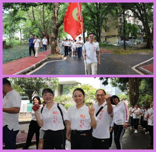 午餐前,天气由雨转晴,老师们的校园内进行“携手同行健步走 精神饱满迎评估”活动,健步走路线由八坡工会之家出发到学校南门大礼堂进行合影留念,随后从四坡回到八坡工会之家。