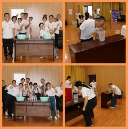 最后一个活动是陈晓洁和周在翱老师主持的“运水接力比赛”,老师们通过用嘴咬着一次性杯子在水盆里面舀水进行短距离接力,比赛时间限定为三分钟,时间到后储水多的队伍获胜。