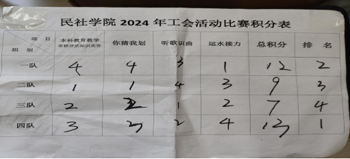 经过四个项目的激烈比拼,每组队伍都以十分地热情参与到竞赛中,以旺盛的斗志完成每一项游戏。最终第四组以13分的积分获得了第一名,第二至第四名分别是第一组、第二组和第三组。