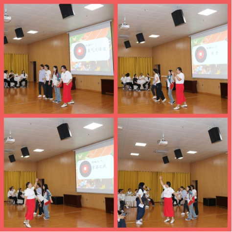首先进行的是游戏竞赛。第一个游戏项目是廖珮淇和杨昉老师主持的“你画我猜”游戏,通过队友的比划猜词语或者句子,老师们在略带滑稽的表演中迅速进入游戏状态,遇到较难的题目时抓耳挠腮的表演实在令人捧腹。