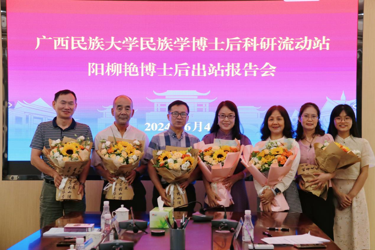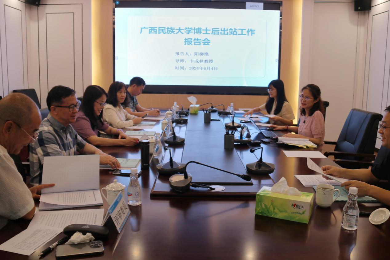 2024年6月4日下午,民族学博士后科研流动站阳柳艳博士后的出站报告会在广西民族大学中华民族共同体意识研究院309会议室举行。由中央民族大学李锦芳教授、桂林旅游学院陈小燕教授、广西民族大学张景霓教授,广西民族大学康忠德教授、广西民族大学王东昕教授担任报告会的评审专家。