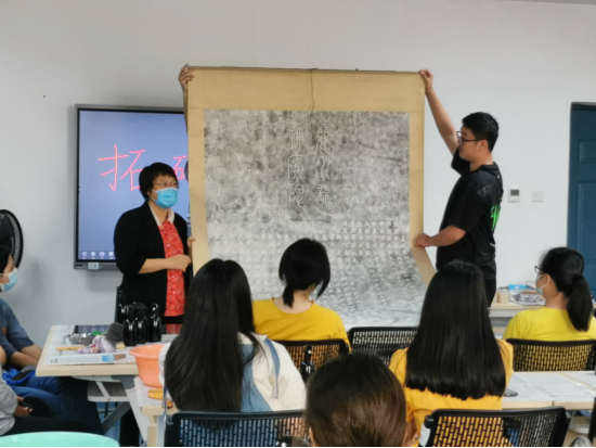滕老师向学生们讲解拓碑的细节和注意事项,文物与博物馆专业的几位研究生从旁辅助指导,同学们都兴致盎然,积极动手操作。活动结束,老师对同学们的拓印作品进行点评与总结,为同学们展示了几副拓印作品,并对拓碑上面的文字进行解读,如碑拓《昆仑关题壁词》中提及有关侬智高的相关历史事件,将碑文史料与当时的历史史实相结合,使同学们深切体会到碑文史料在历史学习研究中的重要价值。