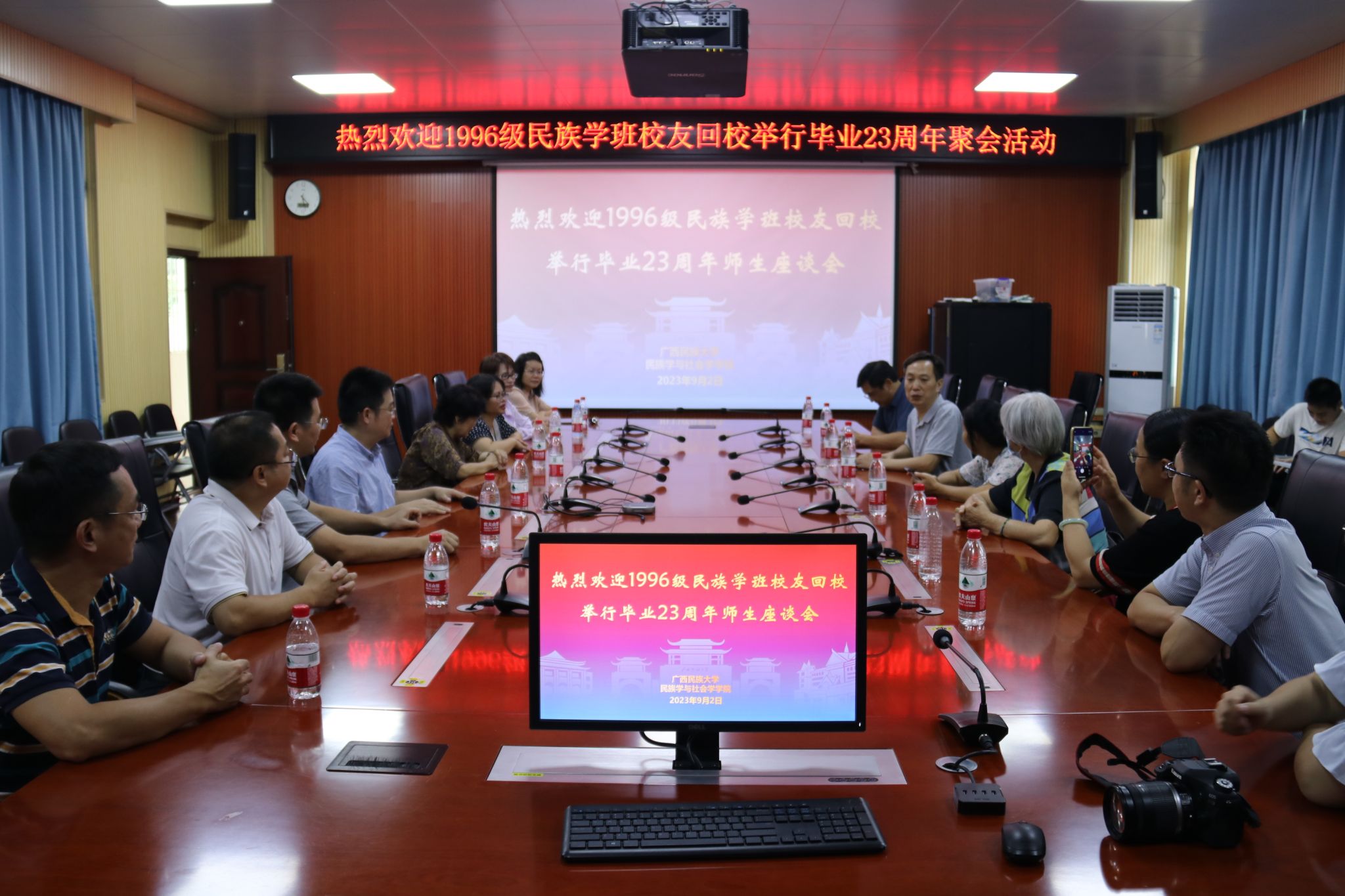 2023年9月2日下午,明升体育881996级民族学班十余名校友携同家属在基地楼103会议室举行了毕业23周年返校聚会活动。这次活动由李杰校友带头组织,学院院长郝国强、副院长黄兰红,民族学系教师吴国富、黎永励,原民族研究所副所长韦玲以及退休老教授李土玉等参加座谈会。会议由吴国富老师主持。
