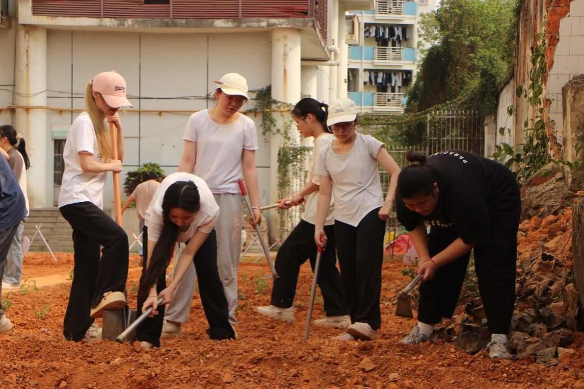 4月11日下午,王颖超带领学生们手持铁铲、铁锹等工具,来到大学生活动中心旁的农耕田,指导并示范如何翻整土地、处理杂石。强烈的日光很快就让劳作的同学们汗湿了衣襟,但酷热并未击退大家的热情,学生们积极投入开荒工作,大家全力拔除扎根颇深的杂草、清理表面的石块。大家在摸索中相互学习,逐渐掌握了耕作技巧,劳动进度也随之加快。经过两个小时的辛勤劳作,荒地变得平坦松软,为后续作物种植的做好了准备。